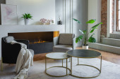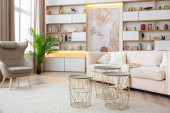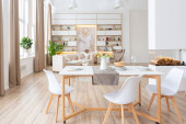 Zdjęcie "aranżacja wnętrz przestronne jasne studio w stylu skandynawskim i ciepłe pastelowe białe i beżowe kolory. modne meble w salonie i nowoczesne szczegóły w kuchni." może być wykorzystywane do celów osobistych i komercyjnych zgodnie z warunkami zakupionej licencji Royalty-free. Obraz jest dostępny do pobrania w jakości wysokiej rozdzielczości do 5760x3840.