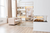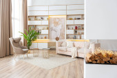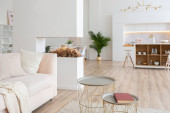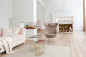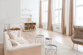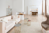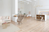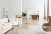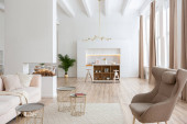 aranżacja wnętrz przestronne jasne studio w stylu skandynawskim i ciepłe pastelowe białe i beżowe kolory. modne meble w salonie i nowoczesne szczegóły w kuchni.