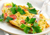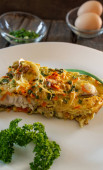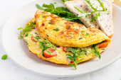 Śniadanie Keto. Omelette z filetem z kurczaka, pomidorami i szparagami na białym drewnianym stole. Włoska frittata. Keto, ketogenny lunch..