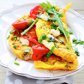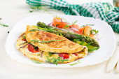 Ketogeniczne śniadanie. Omelette z pomidorami, czerwoną cebulą, kanapką z łososiem i pieczonymi szparagami. Włoska frittata. Keto, ketogenny lunch..