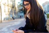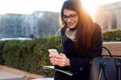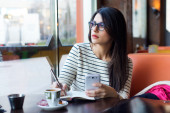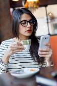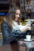 Młoda kobieta piękne za pomocą jej telefon komórkowy w kawie.