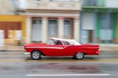HAVANA, CUBA - PAŹDZIERNIK 21, 2017: Stary samochód w Hawanie, Kuba. Pojazd Retro zazwyczaj używany jako taksówka dla mieszkańców i turystów. Panning czerwony kolor samochodu