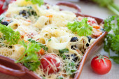 Sałatka z makaronem z suszonymi pomidorami, trufla ser oleju i parmezanem