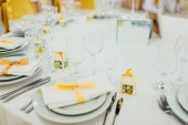 Ślubne. Bankiet. Krzesła i okrągły stół dla Gości, podawane z sztućce, kwiaty i naczynia i pokryte obrus