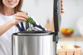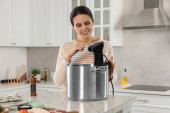 Kobieta wkłada łososia pakowanego próżniowo do garnka i używa cyrkulatora termicznego przy stole w kuchni. Sous vide gotowanie