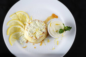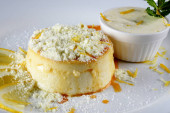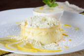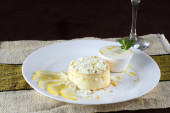 Pyszne mleko skondensowane i budyń kokosowy na białym talerzu - budyń kokosowy z jajkami posypanymi mlekiem w proszku