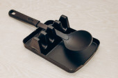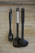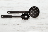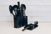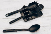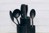 Narzędzia kuchenne plastikowe do wielokuchenki na drewnianym stole w organizer naczynia.