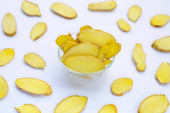 Zdjęcie "Ginger plastry na białym tle." może być wykorzystywane do celów osobistych i komercyjnych zgodnie z warunkami zakupionej licencji Royalty-free. Obraz jest dostępny do pobrania w jakości wysokiej rozdzielczości do 5760x3840.