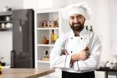 Zdjęcie "Uśmiechnięty kucharz w mundurze w restauracji, miejsce na tekst" może być wykorzystywane do celów osobistych i komercyjnych zgodnie z warunkami zakupionej licencji Royalty-free. Obraz jest dostępny do pobrania w jakości wysokiej rozdzielczości do 5760x3840.
