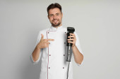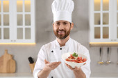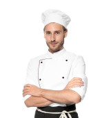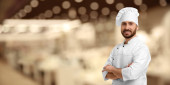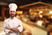 Uśmiechnięty kucharz w mundurze w restauracji, miejsce na tekst