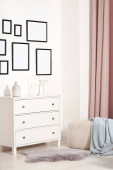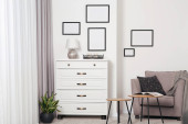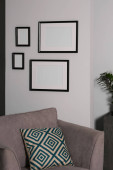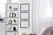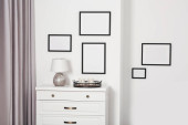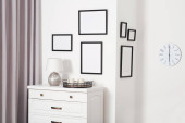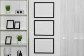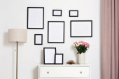 Puste ramy wiszące na białej ścianie, kubkach i lampie wewnątrz