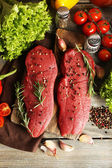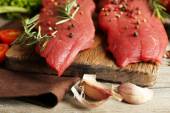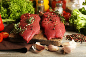Surowy befsztyk z przypraw i zieleni na stole z bliska