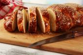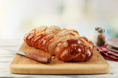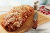 Plasterki świeżego kok na deska do krojenia na jasnym tle