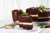 Zdjęcie "Pyszne ciasto czekoladowe na stole z bliska" może być wykorzystywane do celów osobistych i komercyjnych zgodnie z warunkami zakupionej licencji Royalty-free. Obraz jest dostępny do pobrania w jakości wysokiej rozdzielczości do 5760x3840.
