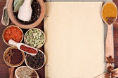 Różnego rodzaju przypraw w miseczki i łyżki na arkuszu papieru puste na drewniane tła