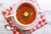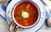 Ukraiński buraki zupa - barszcz, w serwetkę, na tle drewniane