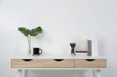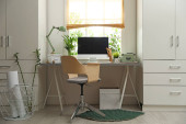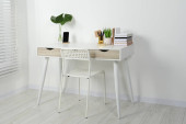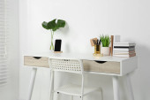 Zdjęcie "Wygodne miejsce pracy z białym biurkiem w pobliżu ściany w pomieszczeniach" może być wykorzystywane do celów osobistych i komercyjnych zgodnie z warunkami zakupionej licencji Royalty-free. Obraz jest dostępny do pobrania w jakości wysokiej rozdzielczości do 5760x3840.