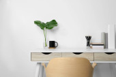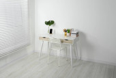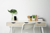 Wygodne miejsce pracy z białym biurkiem w pobliżu ściany w pomieszczeniach