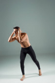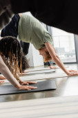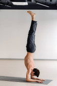 Dojrzały mężczyzna robi Supported Headstand asana na macie w studio jogi