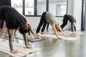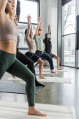 Wieloetniczni ludzie ćwiczący Crescent Lunge asana na matach na zajęciach jogi