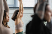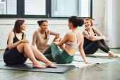 Uśmiechnięta Afroamerykanka siedząca na macie w studiu jogi