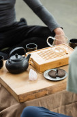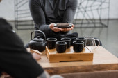 przycięty widok szczęśliwy mężczyzna w średnim wieku z szarą brodą gospodarstwa skompresowaną czystą herbatę w studio jogi
