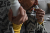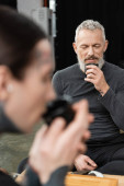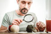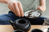 mężczyzna w średnim wieku z szarą brodą pachnącą sfermentowaną czystą herbatą na talerzu