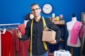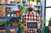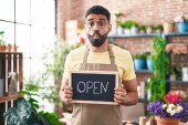 Zdjęcie "Młody biały mężczyzna pracujący w kwiaciarni z otwartym znakiem nadętym policzkiem i śmieszną twarzą. usta napompowane powietrzem, łapie powietrze. " może być wykorzystywane do celów osobistych i komercyjnych zgodnie z warunkami zakupionej licencji Royalty-free. Obraz jest dostępny do pobrania w jakości wysokiej rozdzielczości do 5760x3840.