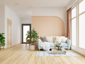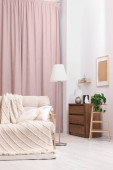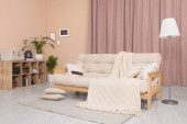 Wygodna sofa, poduszki i koc w przytulnym pokoju. Projekt wnętrza