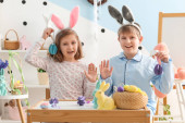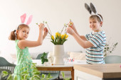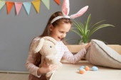 Dziewczynka w króliczych uszach z królikiem wielkanocnym w domu