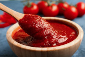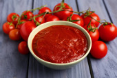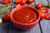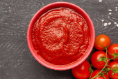 Miska ze smaczną pastą pomidorową na stole, zbliżenie