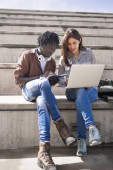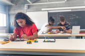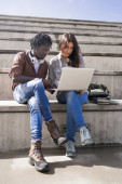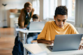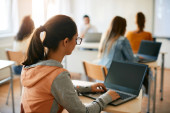Zdjęcie "Uśmiechnięta Afroamerykanka ubrana w okulary stojąca na laptopie w klasie" może być wykorzystywane do celów osobistych i komercyjnych zgodnie z warunkami zakupionej licencji Royalty-free. Obraz jest dostępny do pobrania w jakości wysokiej rozdzielczości do 5760x3840.
