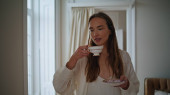 Gorgeous woman posing camera at windows interior portrait. Seductive girl relax alone at white curtain background closeup. Sensual lady with soft skin spending morning at comfortable apartment