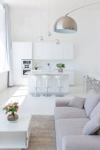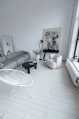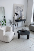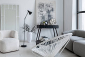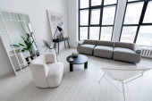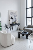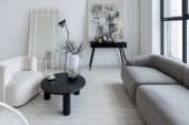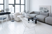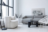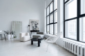 nowoczesny minimalistyczny wystrój wnętrz jasnego pokoju monochromatycznego z czarno-białymi meblami, czystymi białymi ścianami i ogromnymi oknami
