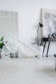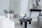 nowoczesny minimalistyczny wystrój wnętrz jasnego pokoju monochromatycznego z czarno-białymi meblami, czystymi białymi ścianami i ogromnymi oknami