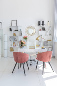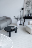 Zdjęcie "nowoczesny minimalistyczny wystrój wnętrz jasnego pokoju monochromatycznego z czarno-białymi meblami, czystymi białymi ścianami i ogromnymi oknami" może być wykorzystywane do celów osobistych i komercyjnych zgodnie z warunkami zakupionej licencji Royalty-free. Obraz jest dostępny do pobrania w jakości wysokiej rozdzielczości do 5760x3840.