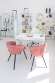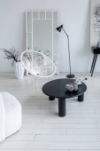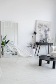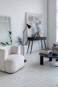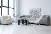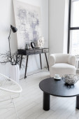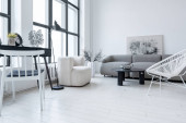 nowoczesny minimalistyczny wystrój wnętrz jasnego pokoju monochromatycznego z czarno-białymi meblami, czystymi białymi ścianami i ogromnymi oknami