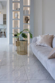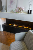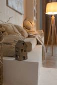 przytulne ciepłe wnętrze domu elegancki dom z otwartym planem, wykończenia drewna, ciepłe kolory i palenisko rodzinne. widok na teren rekreacyjny dla rodzin i gości