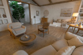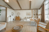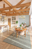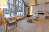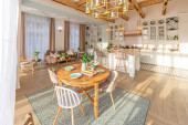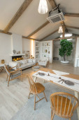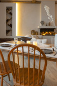 przytulne ciepłe wnętrze domu elegancki dom z otwartym planem, wykończenia drewna, ciepłe kolory i palenisko rodzinne. widok na jadalnię, nakrycie stołu i stołu