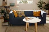Zdjęcie "Poziomy obraz zaprojektowany salon z wygodną sofą i poduszką dla zwierzaka" może być wykorzystywane do celów osobistych i komercyjnych zgodnie z warunkami zakupionej licencji Royalty-free. Obraz jest dostępny do pobrania w jakości wysokiej rozdzielczości do 5760x3840.