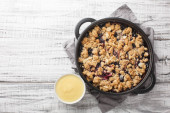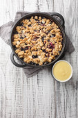 Szwedzki placek Smulpaj pieczony z jabłkami i jagodami zbliżenie na patelni na stole. Vertica