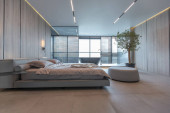 ciemny nowoczesny stylowy apartament męski wnętrze z oświetleniem, dekoracyjne ściany, kominek, garderoba i ogromne okno