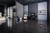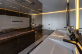 ciemny nowoczesny stylowy apartament męski wnętrze z oświetleniem, dekoracyjne ściany, kominek, garderoba i ogromne okno