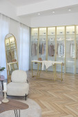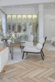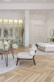 ciemny nowoczesny stylowy apartament męski wnętrze z oświetleniem, dekoracyjne ściany, kominek, garderoba i ogromne okno