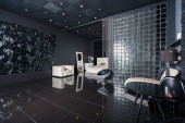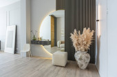 ciemny nowoczesny stylowy apartament męski wnętrze z oświetleniem, dekoracyjne ściany, kominek, garderoba i ogromne okno
