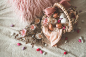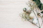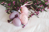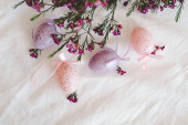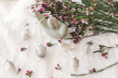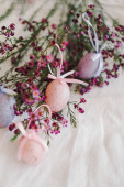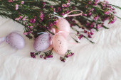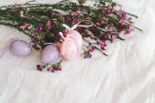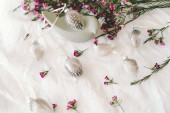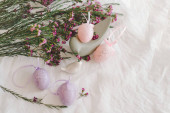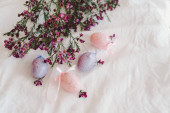Pisanki z kwiatami na białej tkaninie lnianej. Koncepcja wiosny i Wielkanocy.