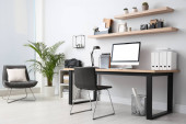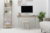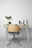 Wygodne miejsce pracy z białym biurkiem w pobliżu ściany w pomieszczeniach