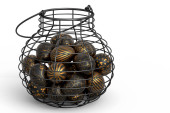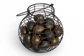 Luksusowe złote jaja w metalowym koszu lub tekturze papierowej izolowane na białym tle. 3d renderowania koncepcji Wielkanoc lub jaj kurzych na omlet lub jajecznicę smażone jajko na śniadanie rano
