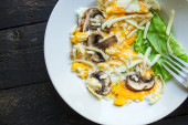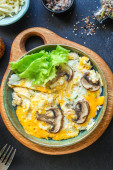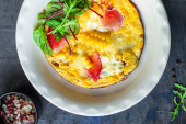 zapiekanka warzywna bakłażan lasagne, cukinia, zielony groszek, ser, sos beszamelowy warzywa posiłek jedzenie przekąska na stole kopia przestrzeń żywności tło rustykalny widok z góry