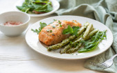 pieczony łosoś podawany ze szparagami, brokułami i marchewką puree
